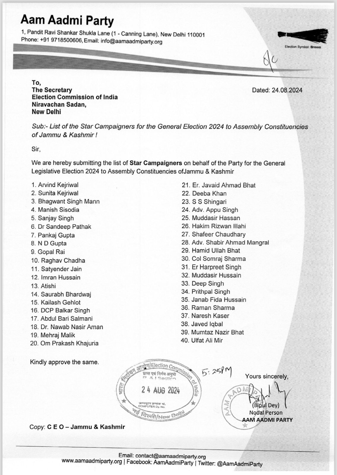जम्मू-कश्मीर विधानसभा चुनाव के लिए AAP ने जारी की 7 उम्मीदवारों की पहली लिस्ट, देखें किसे मिला टिकट?