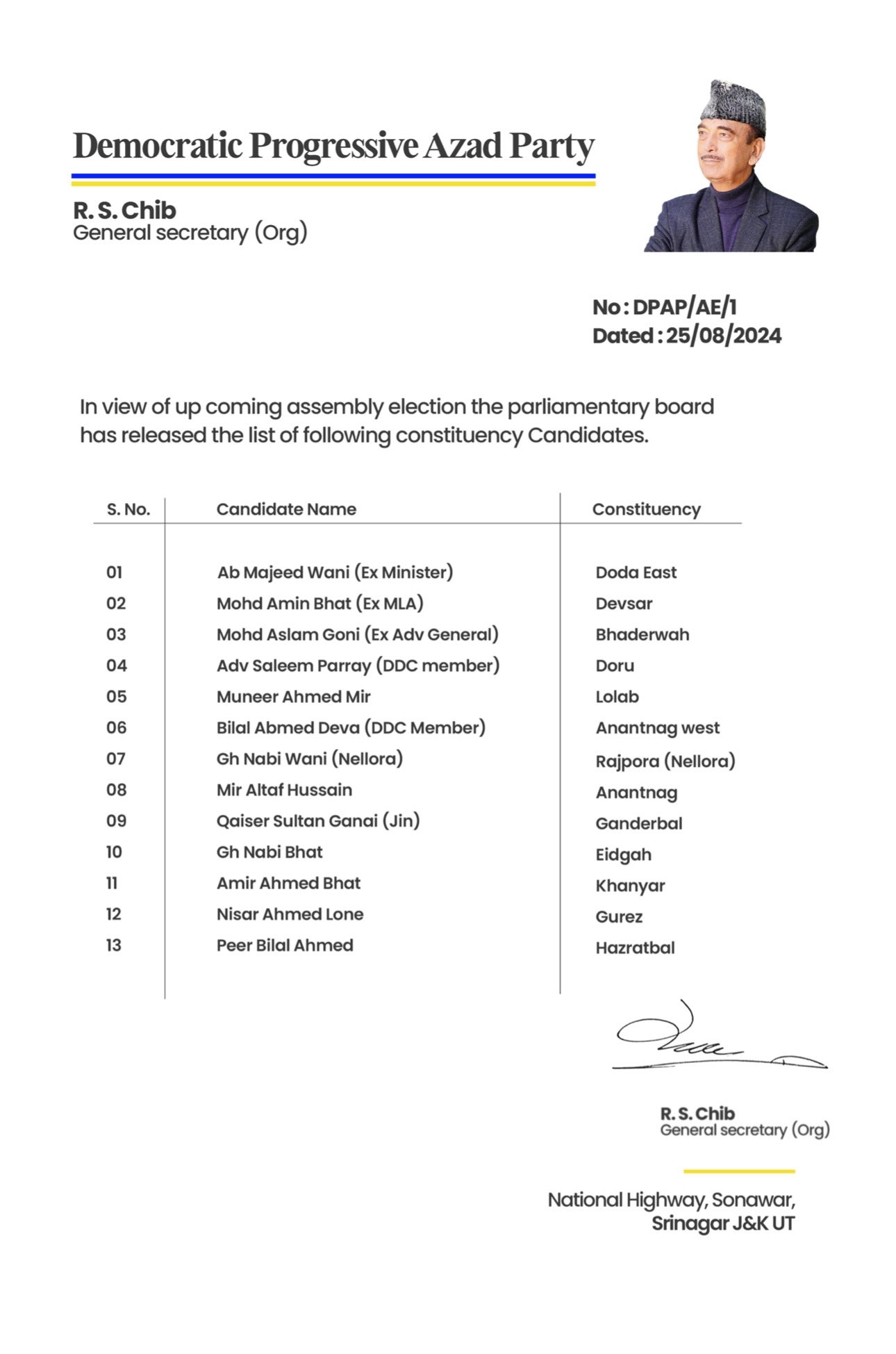 बता दें कि आम आदमी पार्टी की ओर से उम्मीदवारों की लिस्ट जारी किए जाने से थोड़ी ही देर पहले डीपीएपी ने भी अपने प्रत्याशियों की एक लिस्ट जारी की। जम्मू-कश्मीर के पूर्व मुख्यमंत्री गुलाम नबी आजाद ने हाल ही में खुद की एक पार्टी का गठन किया था, जिसका नाम डेमोक्रेटिक प्रोग्रेसिव आज़ाद पार्टी (DPAP) है। गुलाम नबी आजाद की डीपीएपी ने आज 13 प्रत्याशियों की पहली लिस्ट जारी की।