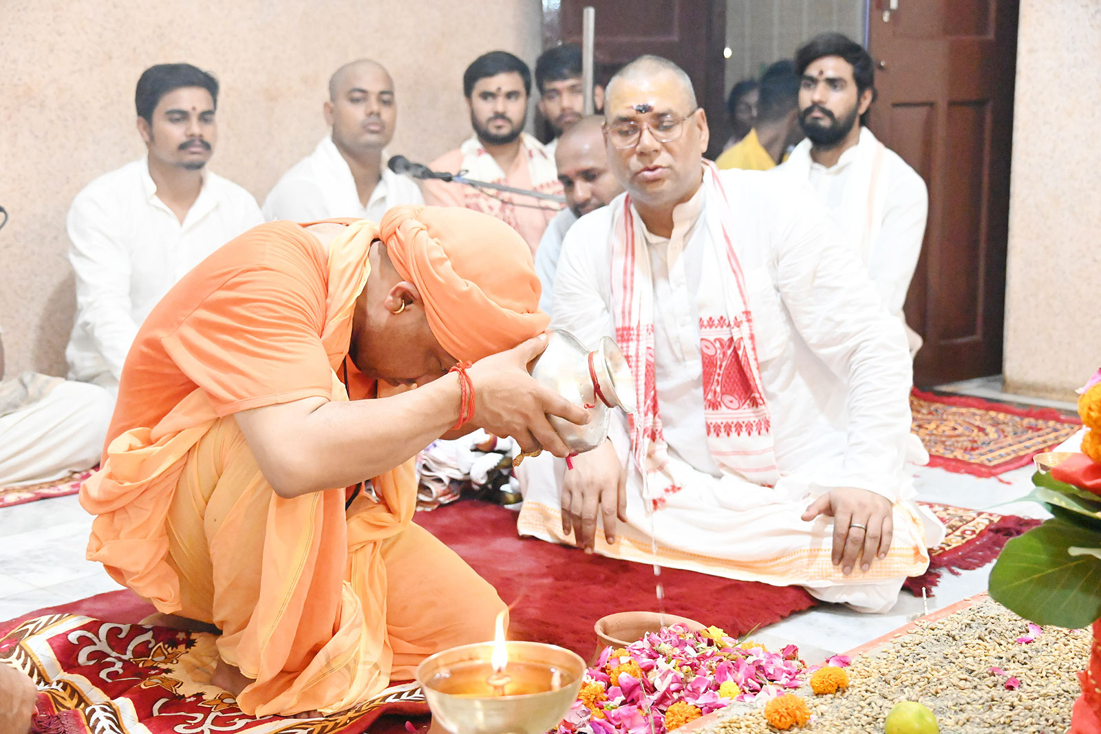 वहां कलश भरने और सरोवर की परिक्रमा के बाद शोभायात्रा वापस शक्तिपीठ आई। इसके बाद जल से भरा कलश मुख्यमंत्री ने स्वयं उठाया और शक्तिपीठ के गर्भगृह में वैदिक मंत्रोच्चार के बीच वरुण देवता का आवाह्न कर इसे स्थापित किया। दुर्गा मंदिर (शक्तिपीठ) के गर्भगृह में श्रीमददेवीभागवत के पारायण पाठ के साथ ही श्रीदुर्गासप्तशती का पाठ भी आरंभ हुआ।