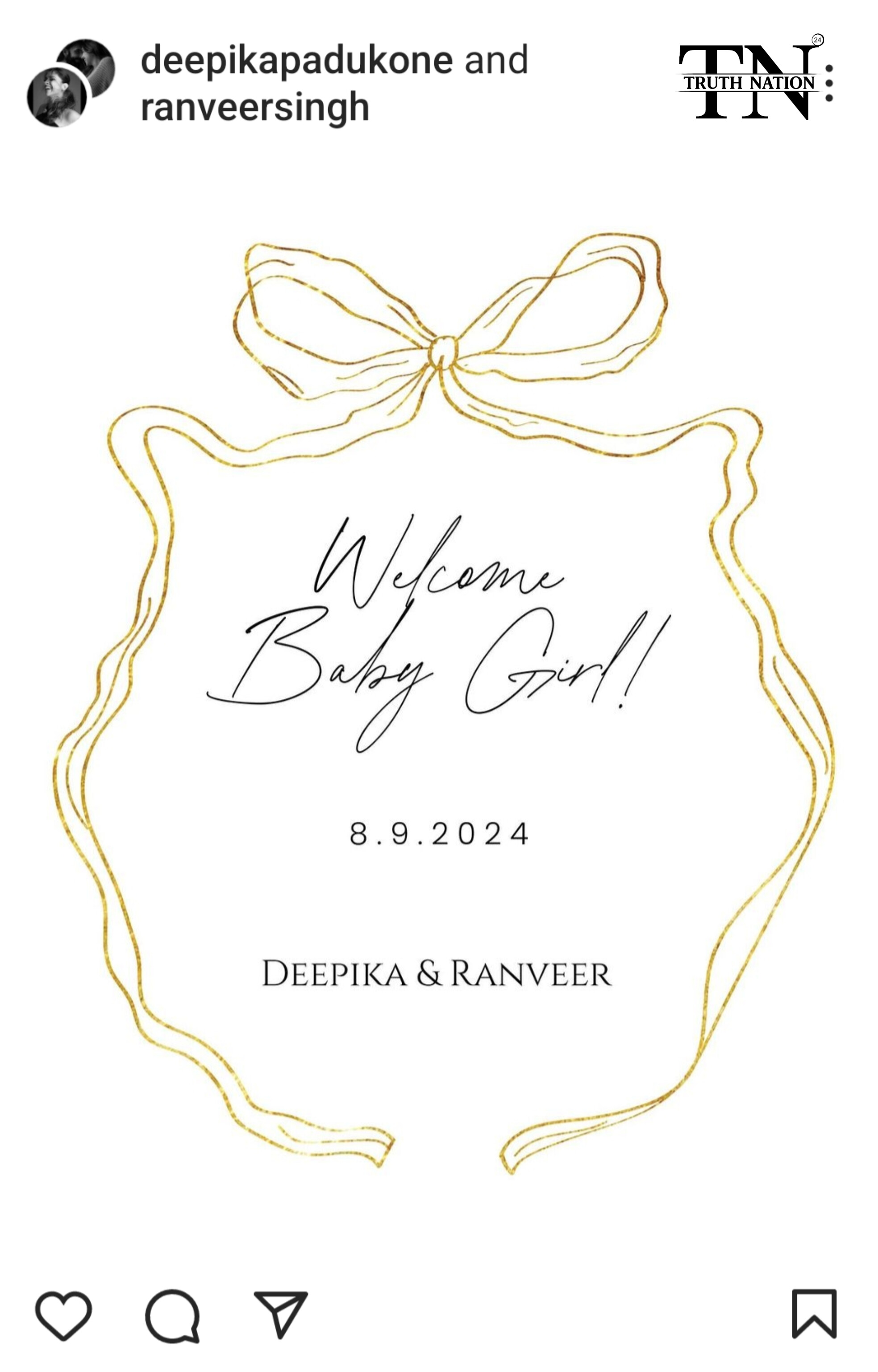 दीपिका पादुकोण और रणवीर सिंह ने अपने आधिकारिक इंस्टाग्राम अकाउंट से एक पोस्टर शेयर किया है। इसमें लिखा है, 'वेलकम बेबी गर्ल, 8.9.2024'। इस पोस्ट को शेयर करते के साथ ही इस पर बधाईयों का तांता लग गया है। एक तरफ फैंस कपल को बधाई दे रहे हैं तो वहीं बॉलीवुड जगत के सितारे भी बेबी गर्ल को आशीष दे रहे हैं और रणवीर-दीपिका को बधाई। अर्जुन कपूर ने लिखा है, 'लक्ष्मी आई है! क्वीन आ गई है'। वहीं, इस पोस्ट के सामने आने के बाद फिल्म इंडस्ट्री के लोग कपल को बधाई दे रहे हैं।