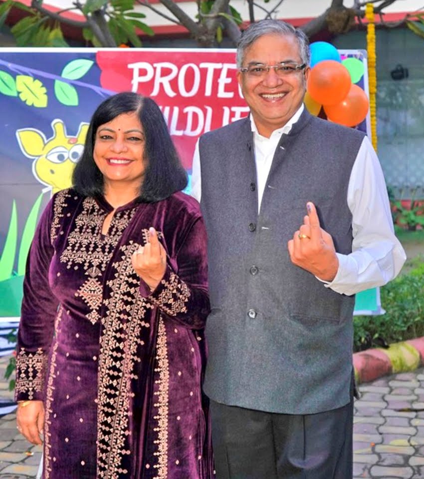 थल सेनाध्यक्ष (Chief of Army Staff) जनरल उपेंद्र द्विवेदी और उनकी पत्नी सुनीता द्विवेदी ने के. कामराज लेन में मतदान किया। (PTI Photo)