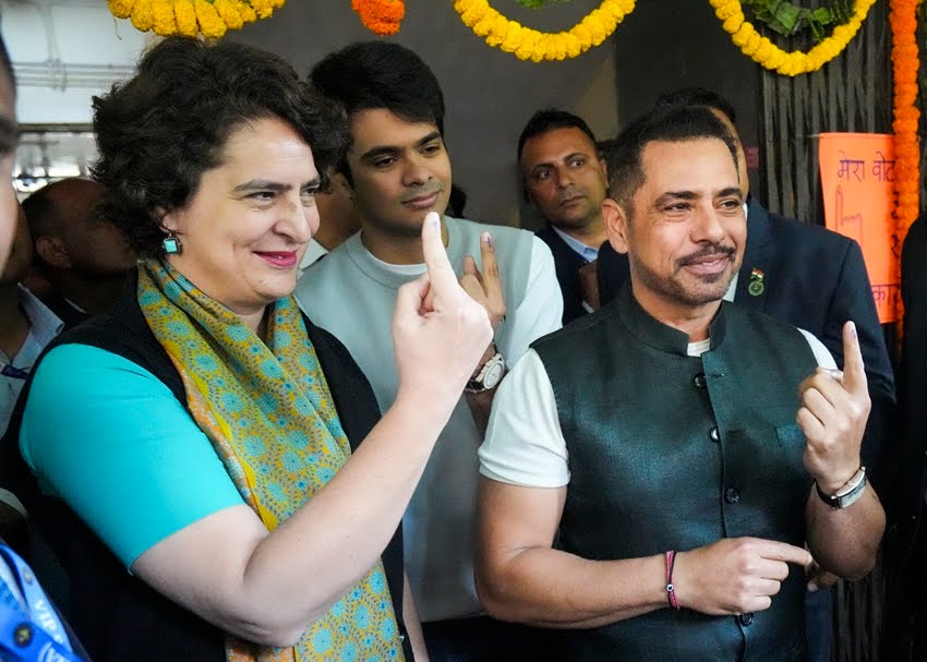 कांग्रेस सांसद प्रियंका गांधी वाड्रा अपने पति रॉबर्ट वाड्रा और बेटे रायहान वाड्रा के साथ लोधी एस्टेट में मतदान करने पहुंचीं। PTI Photo)