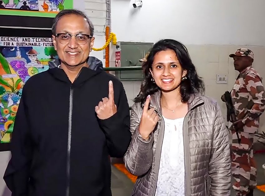 AAP नेता मनीष सिसौदिया अपनी पत्नी सीमा सिसौदिया के साथ दिल्ली विधानसभा चुनाव के दौरान वोट डालने के लिए एक मतदान केंद्र पर पहुंचे। (PTI Photo)
