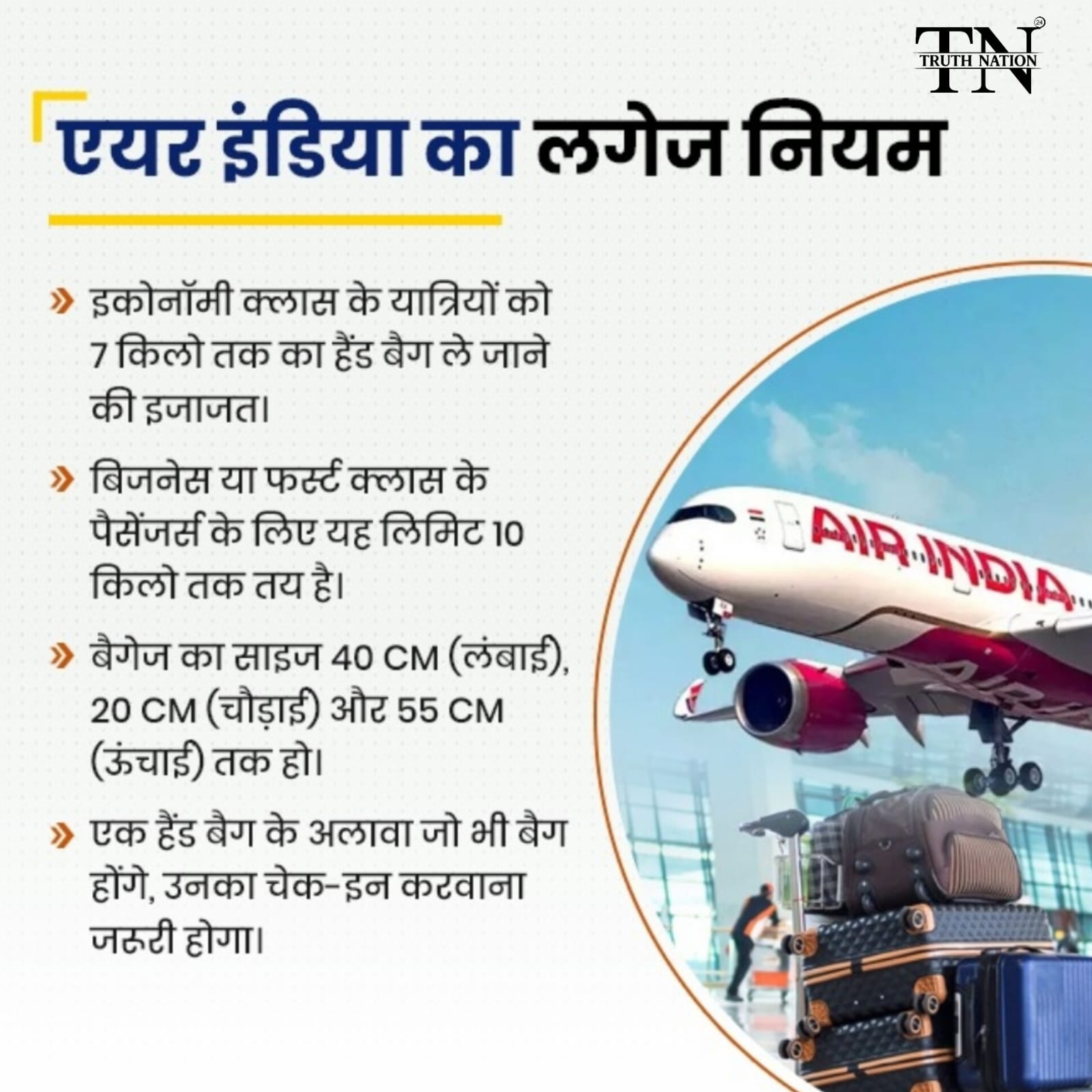 एयर इंडिया के यात्री प्रीमियम इकोनॉमी और इकोनॉमी क्लास में 7 किलोग्राम तक वजन वाला हैंड बैग ले जा सकते हैं। इसका डायमेंशन 115 सेंटीमीटर (लंबाई + चौड़ाई + ऊंचाई) अधिक नहीं होना चाहिए। वहीं, फर्स्ट क्लास और बिजनेस क्लास के पैसेंजर्स 10 किलोग्राम तक का बैग ले जा सकते हैं। प्रत्येक यात्री केबिन बैगेज के अलावा लैपटॉप बैग या लेडीज पर्स भी ले जा सकता है। बशर्ते वह सीट के नीचे समा सके और उसका वजन 3 किलोग्राम से अधिक न हो।