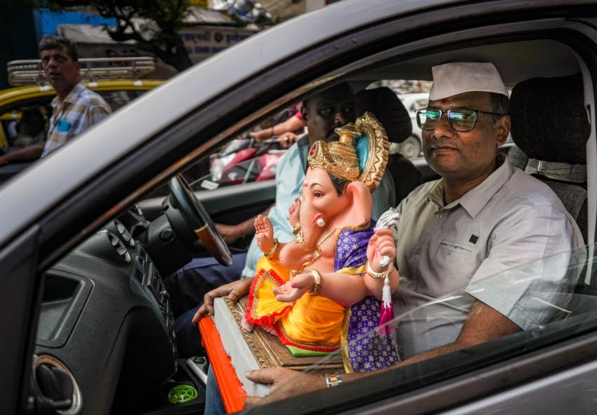 पुणे में गणेश चतुर्थी उत्सव की पूर्व संध्या पर एक परिवार भगवान गणेश की मूर्ति ले जाता नजर आ रहा है। गणपति बप्पा को अपने घर ले जाते वक्त परिवार के चेहरों पर खुशी साफ नजर आ रही है।