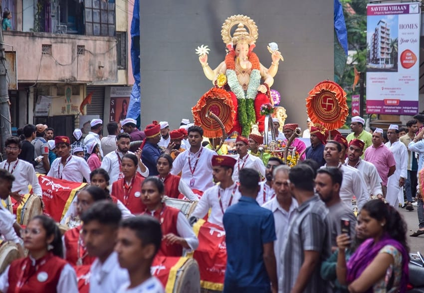 इस तस्वीर में सतारा जिले के कराड में गणेश चतुर्थी उत्सव से पहले भक्तों को भगवान गणेश की मूर्ति को पंडाल में ले जाते हुए देखा जा सकता है।