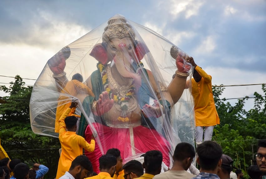 कराड में गणेश चतुर्थी उत्सव की पूर्व संध्या पर भक्त भगवान गणेश की मूर्ति को पंडाल में ले जाने से पहले ढकते नजर आ रहे हैं।