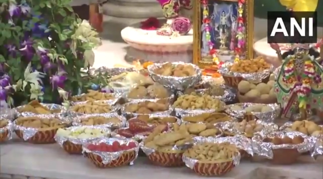 उत्तर प्रदेश के नोएडा में कृष्ण जन्माष्टमी के अवसर पर आधी रात को कृष्ण जन्म से पहले नोएडा के इस्कॉन मंदिर में प्रसाद के रूप में 56 भोग चढ़ाया गया।